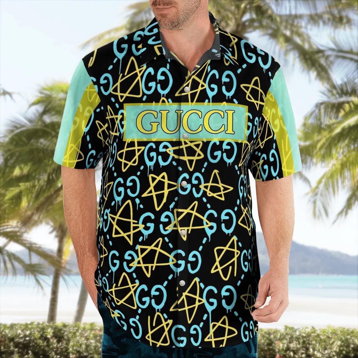 GC light blue yellow pattern black luxury brand premium fashion hawaii shirt for men PEA31226